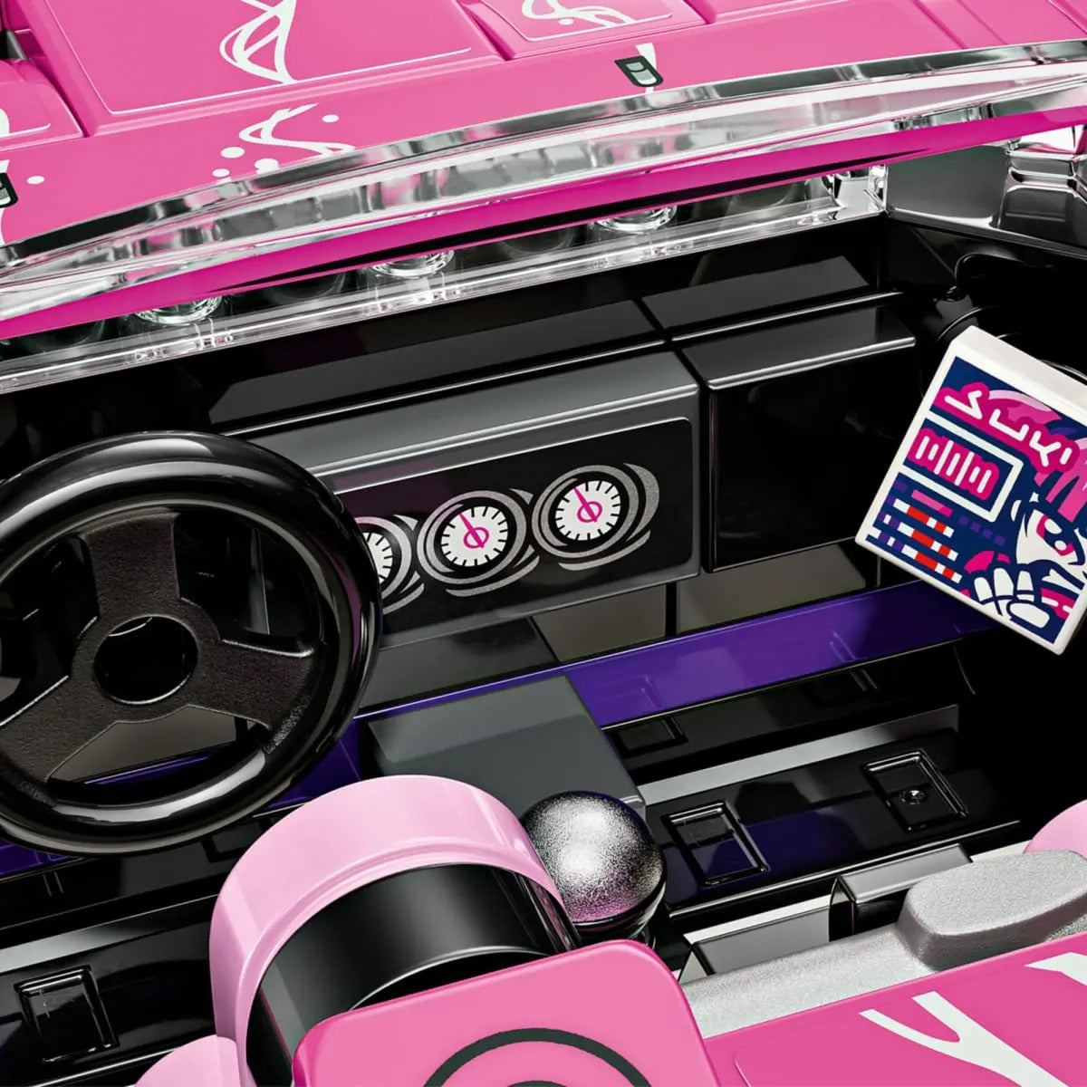 Composto por 300 peças, o kit oferece uma experiência de construção divertida e envolvente. O carro conta com design realista, incluindo aerofólio traseiro, rodas esportivas, monitor de TV interno e os icônicos gráficos em estilo anime que marcam presença no filme.