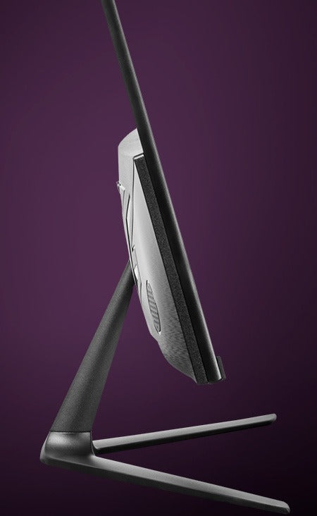 Design moderno com bordas finas e base reclinável, ideal para setups gamer ou uso profissional.